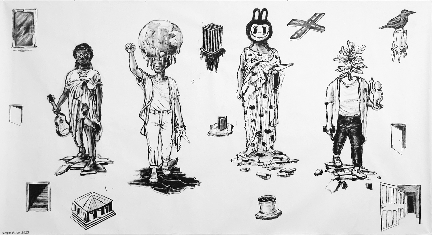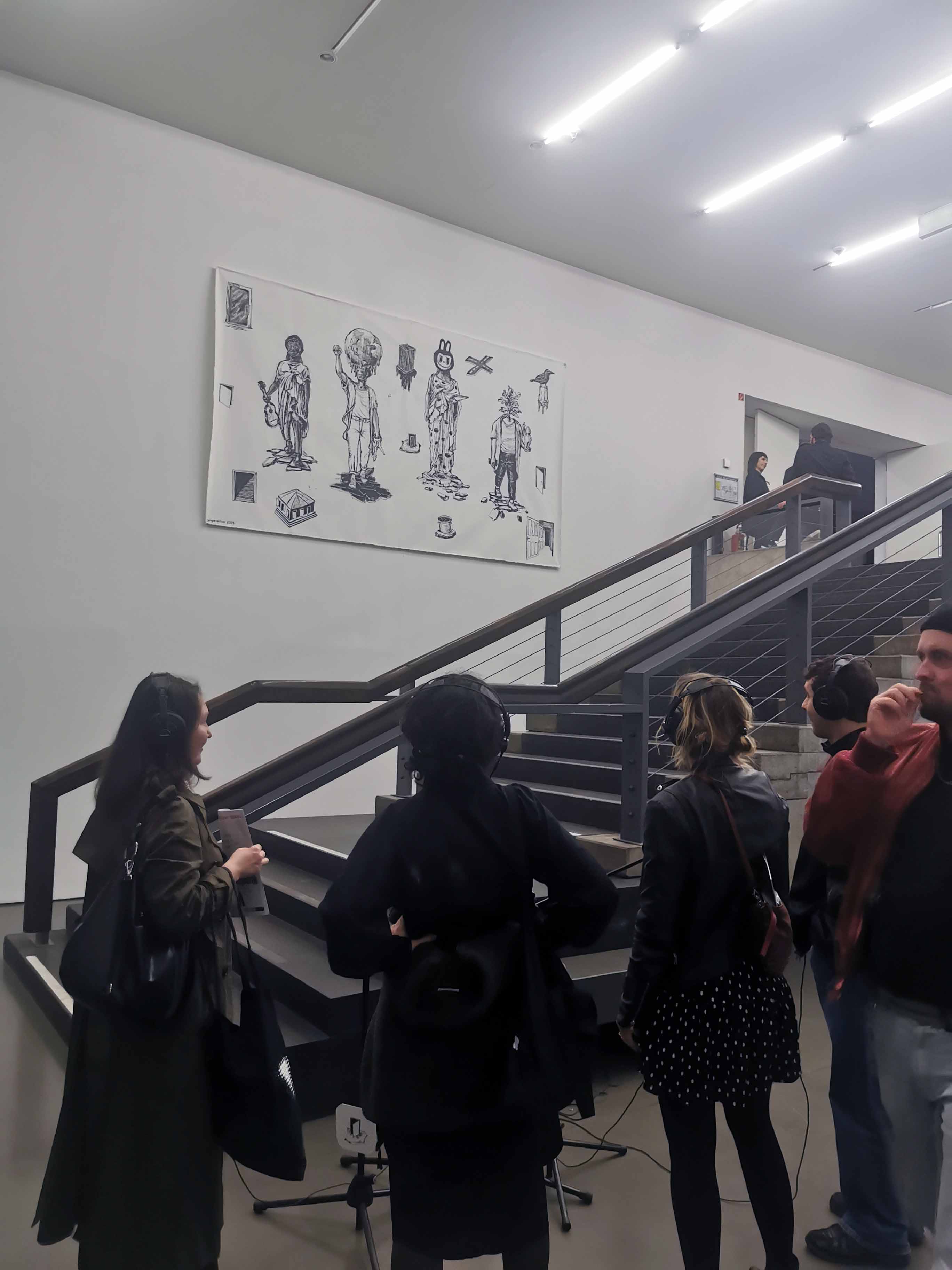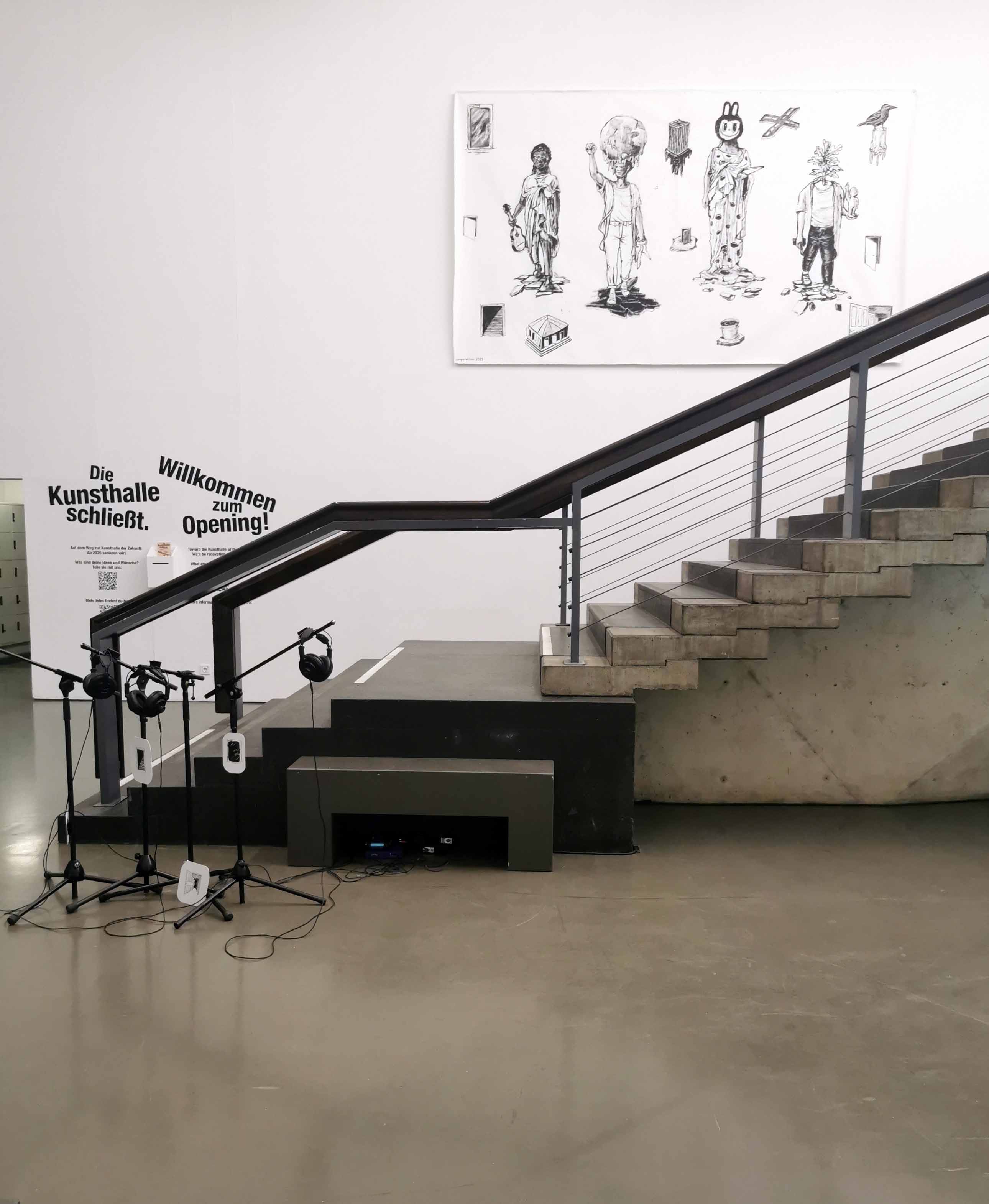 Im Rahmen eines Hörspiels und eines großformatigen Wandbildes im Eingangsbereich der Kunsthalle haben wir die Vier ins Leben zurückgeholt und dabei einen Dialog mit Düsseldorfer*innen initiiert. Die Figuren begeben sich auf eine Reise ins Innere des Gebäudes – von einer Tür durch die nächste. Dabei treffen Stimmen von Passant*innen auf die Erfahrungen und Reflexionen der vier Figuren beim Erkunden der Räume. Erstaunen und Entsetzen mischt sich mit Wünschen, Hoffnungen und Träumen von Räumen der Zukunft.