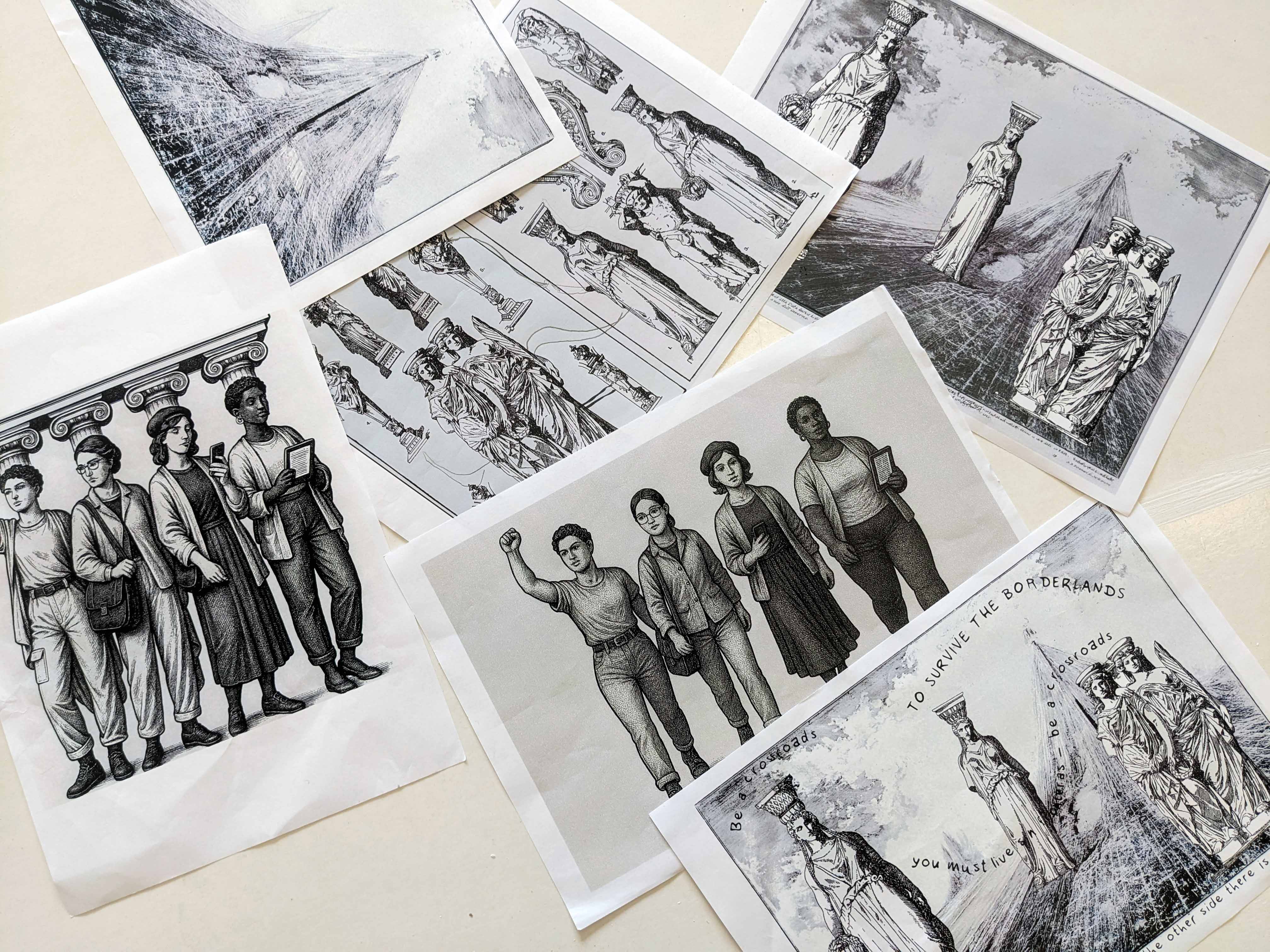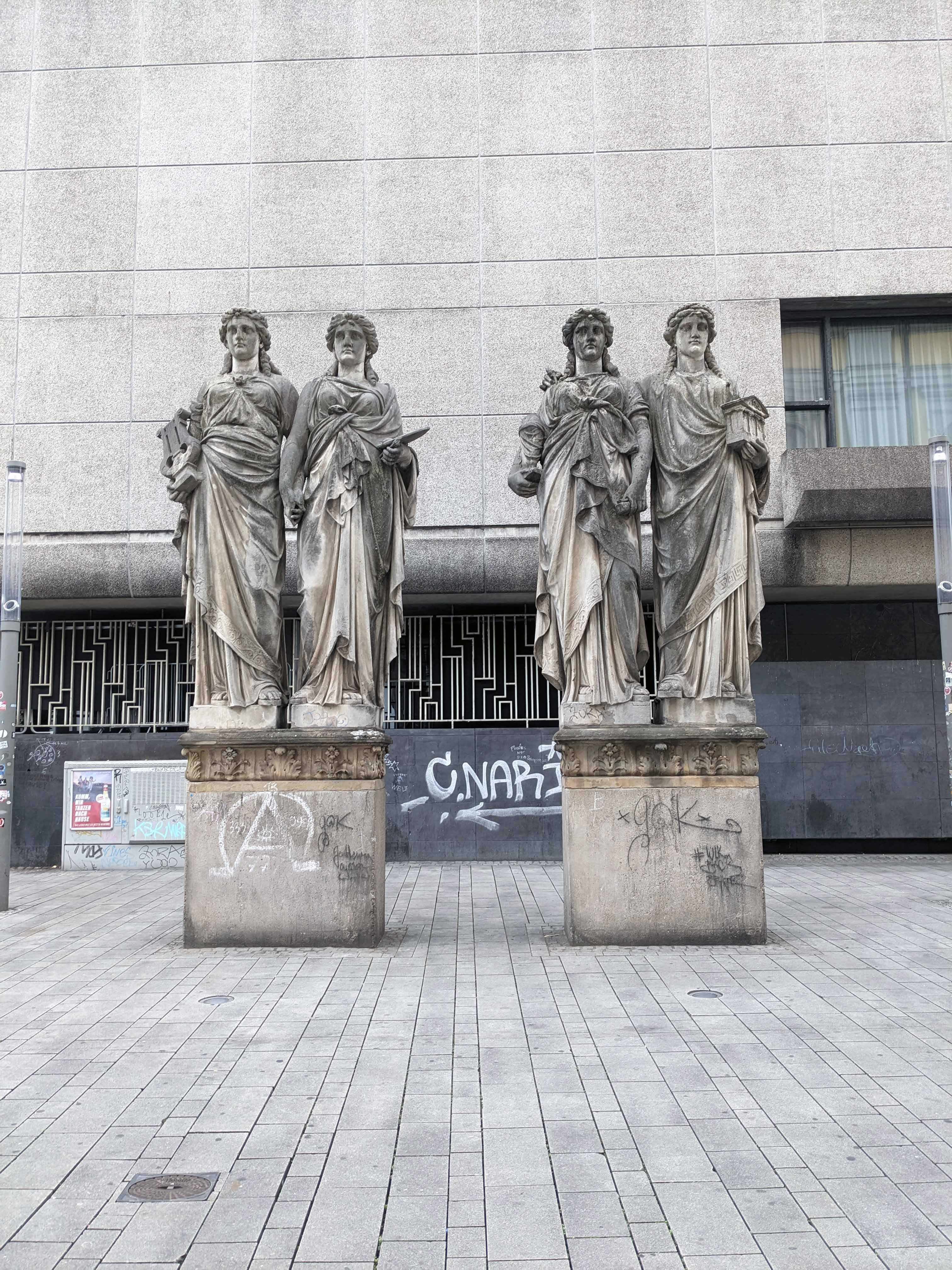 Ausgangspunkt ist die Geschichte der vier Karyatiden in Düsseldorf. Die vier steinernen Figuren sind ein Überbleibsel der im Krieg zerstörten, alten Kunsthalle. Es sind vier weiblich gelesene Figuren, die das Gebäude wie Säulen auf ihren Schultern trugen. Sie wurden restauriert und stehen nun frei vor dem in den 60er Jahren neu errichteten brutalistischen Gebäude.